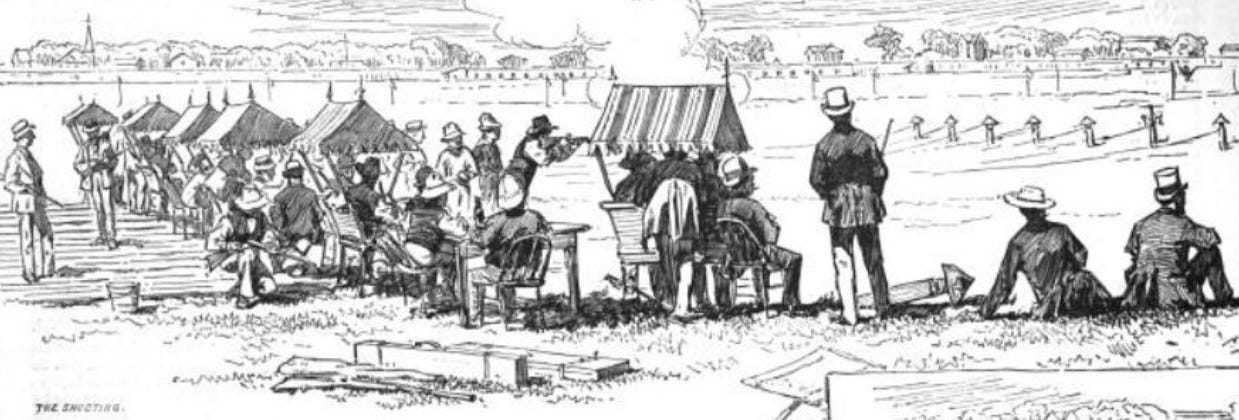 The food for these dinners was often procured through “side hunts,” where club members divided up into teams and competed to see which side could kill the most animals over one or two days. Similarly, the New Orleans Gun Club challenged the Montgomery, Alabama Gun Club in October, 1877 to “join in a grand competitive shooting match for a game dinner.” At the conclusion of their shoot, all the animals they’ve killed would be “counted and turned over to a favorite restaurant, to be served up in a banquet, the losing club paying all the expenses.” Under their scoring system, robins would be worth 1 point; doves, 2; snipe, 8; quail, 10; mallards, 15; squirrels, rabbits, and other ducks, 10; hawks or owls, 25; woodcock, 25; prairie chickens, 30; geese, 50; turkeys, 250; deer, 500; bear, 1,000.14