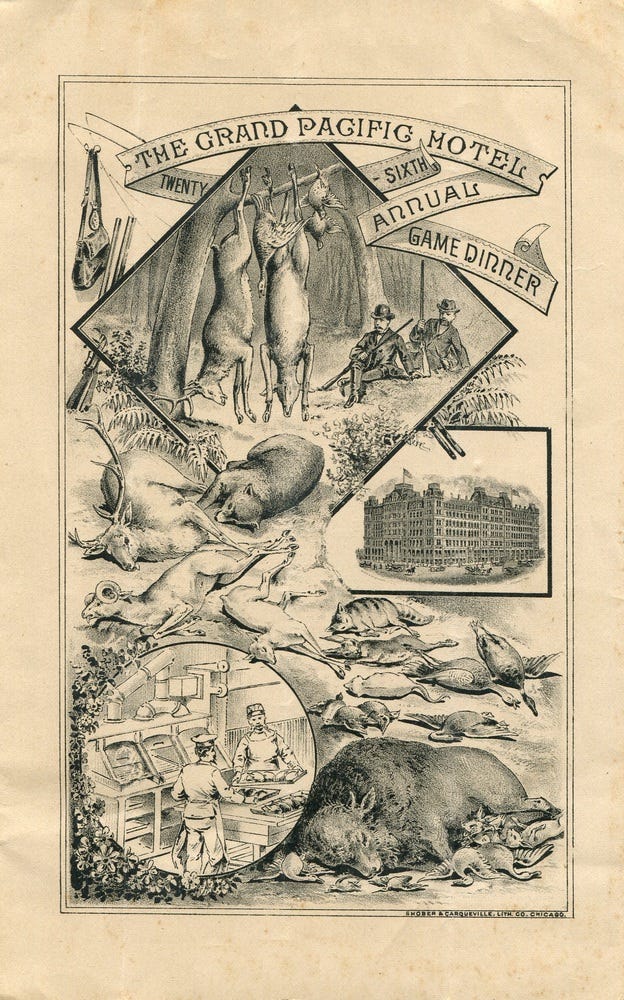 When Tremont House burned down in the Great Chicago Fire of 1871, Drake, like the city, built back bigger and better. He took over management of the newly-built Grand Pacific Hotel where he resumed his game dinners on a scale which he hoped would make up for their four-year absence. His first year back, one reporter editorialized that his chefs “vigorously studied Cuvier, Audubon, Wilson, Buffon, and Baird, in the hope that they might find some member of the animal kingdom that flew in the air, ambled upon the earth, or lived in the sea, hitherto unheard of, to be added to the ‘game dinner’ bill of fare as a surprise.”4 The resumption of this feast in a hotel rising from the ashes came to represent Chicago’s resiliency, and thereafter became a highly-anticipated civic ritual.
