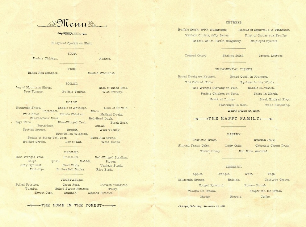 Beside each centerpiece, guests found an elaborately-decorated menu listing the animals who had given their lives for the occasion, including but not limited to: fox squirrel, gray squirrel, whitefish, black bass, black bear, blackbird, buffalo, cinnamon bear, silver-tip bear, mountain sheep, antelope, elk, raccoon, opossum, jackrabbit, English hare, Canada goose, canvasback duck, black duck, gray duck, dusky duck, wood duck, longtail duck, pintail duck, mallard duck, gadwall duck, shoveler duck, scaup duck, butterball duck, buffle-headed duck, bobwhite, golden plover, prairie chicken, reed birds, rice birds, ruffed grouse, pin-tailed grouse, sparrow, snipe, brant, pheasant, oysters, and turtle.